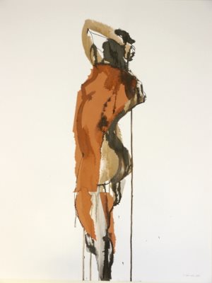 drawings 2012 11 warrier blue 12 standing woman sepia technical details: eastindian black and sepia ink african clay and torn coloured paper on paper size 50x65 cm