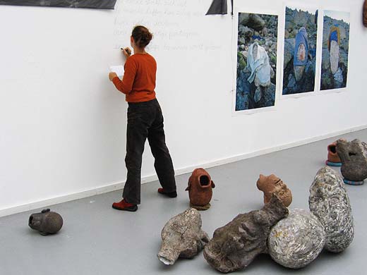 heads ceramic, cement doublehead ceramic, rope, ironhook torn flag poem flag:150cm x 190cm photoprints 100cm x 70cm x 50cm