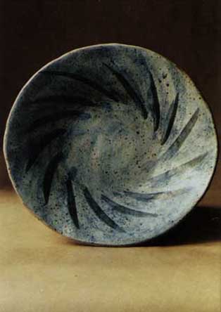 Schale , Steinzeug, Handaufbau Ton :Irak, Dekor, Kobaldoxyd unter OpaqueweissrHöhe 12cm, Durchmesser 24cm