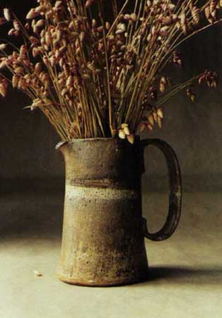 Krug , Steinzeug, Plattentechnik, Höhe ca. 20cm Ton: IRAK , Glasur: Senfgelb über Weissopaqe