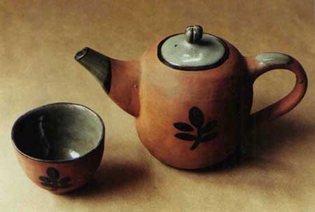 Teekanne , Steinzeug, Daumenschalentechnik, Höhe ca. 15cm Ton: roter Vingerling , aussen teilglasiert blaugrau Dekor: Engobe schwarz