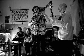Wechsel, Applaus. Danach Musik, das Trio, zwei Gitarren, ein Bass ein